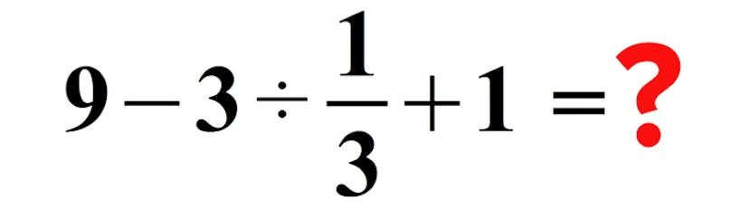 But negative one isn’t the only wrong answer. Other people got tricked by the “three divided by one third” part, largely because they were too crafty for their own good. They neglected to account for the fact that, if you turn the fraction one third into 1/3, the /, mathematically speaking, is actually a division symbol. The result is this: